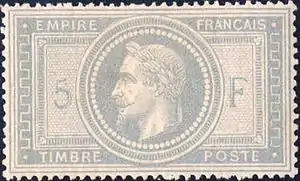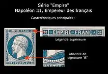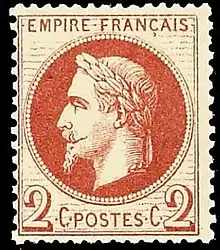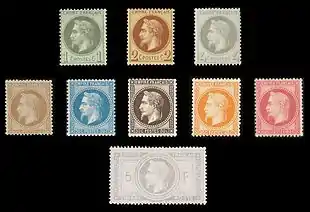 Aussi connue sous l'appellation « Empire lauré », ces timbres ont trois graphismes qui reprennent la même effigie de l'Empereur des français, Napoléon III, en lui ajoutant une couronne de laurier sur la tête, commémorant les succès de la « Campagne d'Italie » et porte la légende complète « empire francais ».