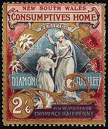 En juin 1897, la colonie britannique de Nouvelle-Galles du Sud émet deux timbres richement illustrés et colorés pour l’époque. Le 1 shilling représente un profil de la reine Victoria et une scène illustrant la charité. Le 2 shilling 6 pence est davantage tourné vers le jubilé de diamant de la reine. Ces timbres véhiculaient deux messages à la fois : d'une part, la commémoration des 60 ans de règne de la reine Victoria, et d'autre part, la campagne de générosité envers les dispensaires réservés aux phtisiques (en anglais : comsumptives home). La surtaxe était particulièrement élevée : pour 1 shilling, le premier timbre permet un affranchissement d’un penny ; pour 2 shilling et 6 pence, le second assure une valeur postale de 2,5 pence. Lors de leur émission, les critiques négatives sont nombreuses : trop forte surtaxe, « timbres d’hospice » pour Arthur Maury, négociant parisien. Les souscripteurs furent difficilement trouvés pour écouler les 40 000 exemplaires imprimés du 1 shilling et les 10 000 du 2 shilling 6 pence.