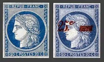 - L'un des plus anciens timbres-poste non émis en raison d'un changement de tarif est le 20c Cérès bleu de 1849 : Cette figurine avait été imprimée à partir d' pour remplacer le 20c noir de la même série par un timbre plus clair sur lequel les annulations apparaîtraient mieux. Mais, par économie, l'administration avait voulu épuiser le 20c noir avant d'émettre la nouvelle figurine. Or, avant que cet épuisement se réalise, le tarif de la lettre simple fut porté, le de 20c à 25c. Dès lors le stock de ce 20c bleu, privé de toute utilité fut détruit. Seuls quelques exemplaires, conservés sans doute comme justificatifs par la Monnaie avant de tomber entre les mains des collectionneurs, ont été conservés.