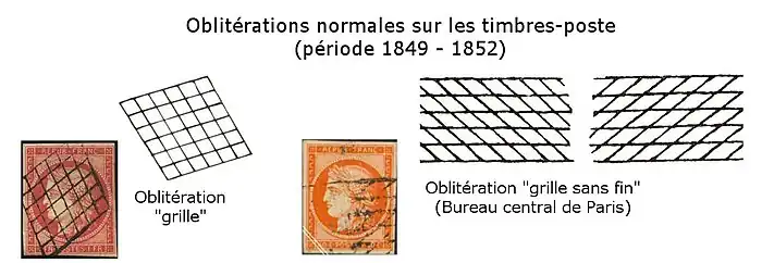 L'annulation du timbre (ou cachet oblitérant) « grille » apparaît en général entre le et le selon les bureaux. Le bureau central de Paris (rue du Louvre) utilise la grille à partir du . La roulette « grille sans fin » apparaît plus tardivement fin 1851, puis début 1852 dans certains bureaux de quartier[9]. Elle est utilisée pour oblitérer les affranchissements composés de plusieurs timbres-poste, particulièrement sur des courriers à destination de l'étranger.