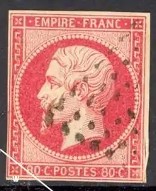 En novembre, est mis en circulation un timbre non dentelé de 80 centimes de couleur rose à l'effigie de l'empereur Napoléon III et légendé « EMPIRE FRANC ». Il remplace un timbre de même valeur de couleur rouge carmin émis fin 1854. Le Directeur général des Postes prend cette décision après des essais de couleur effectués par Anatole Hulot[2].