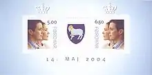 Le , dans le cadre d'une émission conjointe avec le Danemark et le Groenland, est émis un bloc-feuillet de deux timbres de 5 DKK et de 6,50 DKK le jour du mariage du prince héritier de Danemark Frederik avec l'Australienne Mary Donaldson. Leur titre d'« Altesse Royale » explique le titre de l'émission. Le couple de profil, Frederik au premier plan, regarde vers la droite sur le 5 DKK et vers la gauche sur le 6,50 DKK. Entre les deux, une vignette sans valeur postale porte les armes des Féroé. Sur le marge supérieure du feuillet, deux couronnes royales surmontent les timbres. La date, par contre, est écrite en danois (14 Maj) et non en féroïen ().