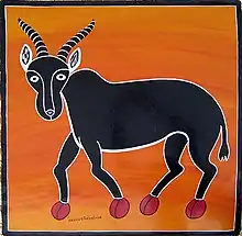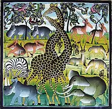 On trouve encore plus fréquemment des représentations animales - assez souvent dans des scènes calmes - qui sont incrustées dans des paysages tanzaniens ou imaginaires. Parfois, les animaux peuvent être affectés à la fois à des domaines de la vie apparemment réels et symboliques. Les parties du visage des animaux représentés rappellent souvent le langage formel des masques et intègrent ainsi la peinture dans une tradition culturelle ancienne.