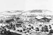 Intérieur du stand de tir lors du tir fédéral de 1863 à La Chaux-de-Fonds.