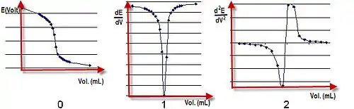 La détermination du point de fin de titrage peut être réalisée par trois méthodes graphiques où l'axe des abscisses est toujours le volume de réactif ajouté [3] :
