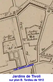 En 1766, Simon-Charles Boutin, fils de Simon Boutin, receveur général des finances de Tours, aménage un vaste jardin, dont l'entrée se situe alors entre les nos 66 et 110 de la rue Saint-Lazare, qu'il baptise Tivoli en référence aux célèbres jardins de la ville italienne de Tivoli et en particulier à celui de la villa d'Este (XVIe siècle). Il y fait édifier plusieurs folies et parsème le terrain de rochers et fausses ruines.