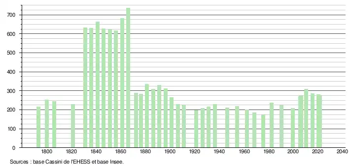 L'évolution du nombre d'habitants est connue à travers les recensements de la population effectués dans la commune depuis 1793. Pour les communes de moins de 10 000 habitants, une enquête de recensement portant sur toute la population est réalisée tous les cinq ans, les populations légales des années intermédiaires étant quant à elles estimées par interpolation ou extrapolation[19]. Pour la commune, le premier recensement exhaustif entrant dans le cadre du nouveau dispositif a été réalisé en 2005[20].
