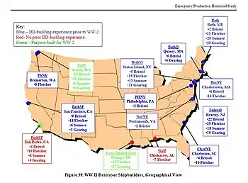 Bien que le chantier de Seattle ait produit le plus grand nombre de destroyers sur la côte ouest, Union Iron Works a été légèrement plus productif dans l'ensemble avec 4 croiseurs classe Atlanta, 9 destroyers classe Benson, 18 destroyers classe Fletcher, 6 destroyers classe Allen M. Sumner, 3 destroyers classe Gearing et 12 destroyers d'escorte de classe Buckley.