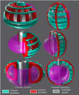- le caractère proportionnellement plus volumineux des aimants poloïdaux dans le tokamak sphérique,