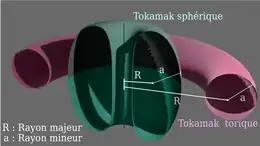 Le schéma 1 représente une coupe polaire d'un plasma d’un tokamak sphérique (en vert) et d'un plasma d’un tokamak torique (en mauve). Les proportions sont celles du tore supra (rapport de forme 4,5) pour le tokamak torique et du MAST-U (rapport de forme 1,2) pour le tokamak sphérique. Pour chaque dispositif, le schéma détaille les mesures du rayon majeur R et du rayon mineur a.