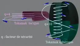 - ils augmentent la pression au niveau du plasma et assurent donc son chauffage et sa circulation en augmentant la puissance du dispositif. Dans ce domaine le ST-40 compte sur ses aimants toroïdaux supraconducteurs chauds pour battre des records[12],[13],[14]. - ils font « vriller » le plasma côté intérieur lui donnant une plus grand stabilité. Cette stabilité est symbolisée par le nombre Q ou « safety factor ». Sa valeur peut être grossièrement appréhendée comme le nombre de tours que fait la particule autour du centre du tokamak pour retrouver sa position initiale. Plus ce nombre est grand plus le plasma est stable. Ce facteur existe aussi dans les tokamaks toriques mais il ne dépasse jamais 4 alors que pour les ST il peut monter jusqu’à 12.
