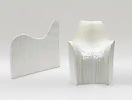 La chaise en papier, intitulée Honey-pop (2001), se transforme de deux dimensions en trois dimensions. Une feuille de 1 cm contient 120 couches de papier fin, quand elle se déplie, une structure en nid d’abeille se forme et la forme ne s’en fixe que lorsque quelqu’un s’assoit dedans[3]. Pane chair(2006) est également une structure fibreuse de plantes, formée d’un entrelacs de fibres de 1 mm. Pendant le processus de fabrication, les blocs de fibres sont mis dans des tubes de papier, l’ensemble est mis au four et chauffé comme du pain et la forme de la chaise est mémorisée et complétée. La chaise en cristaux naturels Venus - Chaise en cristal naturel (2008) est un œuvre qui se transforme en chaise, en laissant se former des cristaux naturels dans un réservoir d’eau jusqu’à ce que se crée une structure cristalline.