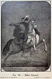 - Propriété de Ion G. Gogălniceanu, aussi dénommé Hora Țărănească[29]à l'intersection des rues I. Radovici[30] et Kogălniceanu, en 1870, une grande maison de commerçant, avec commerces au rez-de-chaussée et un étage d'habitations. Le côté de l'immeuble comprend un frontispice décoré d'un bas-relief représentant deux lions et un buste de Michel le Brave, prince valache à l'origine du fort développement de la ville, et dont la mémoire est souvent rappelée sur les anciens bâtiments ou écrits liés à Ploiești[a 4],[d 2]. Elle est démolie à la suite du tremblement de terre de 1977[31].