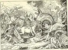 Le dieu Thor en train de combattre Jörmungand (dessin de 1895).