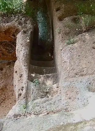 Si un escalier latéral, également taillé dans le tuf, permet de monter sur le sommet du monument, la chambre funéraire n'est plus accessible à cause de l'érosion.