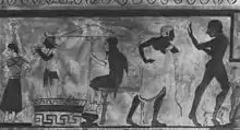 - Cette scène est mieux représentée dans la Tombe des Jongleurs à Tarquinia : Il s'agit d'un lancer de petits plateaux sur un candélabre posé sur la tête de la danseuse dansant au centre au son de la flûte.