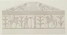 Les figures représentées sont distribuées symétriquement avec sur le mur de face, trois personnages : une femme séparée par un arbrisseau d'un homme barbu qui tient le bras d'un jeune flûtiste ; Sur le mur de droite, un groupe de deux jeunes hommes avec des chevaux tenus par la bride.