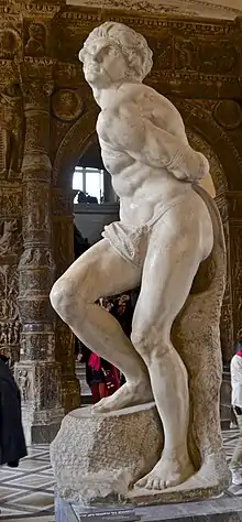 - L'Esclave mourant et L'Esclave rebelle : donnés en 1546 par Michel-Ange à Roberto Strozzi qui les offrit, en exil en France à François Ier (aujourd'hui au Musée du Louvre). Les Esclaves représentent les états de l'âme[1].