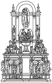 Le registre inférieur est pourvu de deux à quatre niches, contenant chacune une statue de Victoire ailée, encadrée par des statues masculines enchaînées « nues » (dont les sources définissent les « Esclaves » et qui s'inspirent des figures de captifs de l'art romain), adossée aux piliers et surmontée de bustes. L'étage supérieur doit contenir quatre grandes figures assises (parmi lesquelles Condivi mentionne déjà un Moïse, ainsi qu'un Saint Paul (qui avaient personnellement assisté à la révélation divine éblouissante) et les personnifications de la vie active et contemplative, peut-être placés aux coins ou aux façades sur les côtés les plus courts pour guider le regard du spectateur vers le sommet où la statue semi-allongée du pontife se dresse sur la bière, entre des reliefs en bronze et deux figures allégoriques, Anges pour Condivi ou Ciel et Terre pour Vasari. Le sarcophage proprement dit est situé à l'intérieur d'une chapelle ovale à l'intérieur de la structure, accessible depuis un portail sur l'un des côtés courts ou des deux côtés[6]. La statue du pape au sommet, guidée hors du tombeau par deux anges, évoque le réveil du défunt lors du jugement dernier, comme dans le monument sépulcral de Marguerite de Luxembourg par Giovanni Pisano[5].