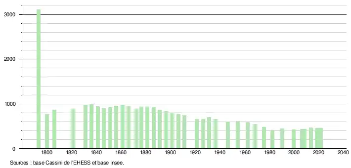 L'évolution du nombre d'habitants est connue à travers les recensements de la population effectués dans la commune depuis 1793. Pour les communes de moins de 10 000 habitants, une enquête de recensement portant sur toute la population est réalisée tous les cinq ans, les populations légales des années intermédiaires étant quant à elles estimées par interpolation ou extrapolation[25]. Pour la commune, le premier recensement exhaustif entrant dans le cadre du nouveau dispositif a été réalisé en 2008[26].