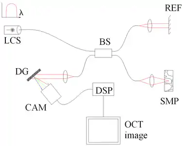 ![]() Fig. 4 OCT spectrale (ou fréquentielle ou dans le domaine de Fourier), encodée spatialement (SE-FD-OCT). Composants : source peu-cohérente (LCS), séparatrice 50/50 (BS), référence (REF) et échantillon (SMP), réseau de diffraction (DG), détecteur plein-champ (CAM) agissant comme un spectromètre, analyseur de données numérique (DSP). |