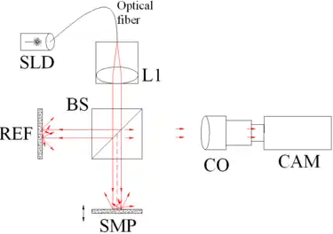 ![]() Fig. 1 OCT plein champ. Composants : diode superluminescente (SLD), lentille convexe (L1), séparatrice 50/50 (BS), objectif de la caméra (CO), caméra CMOS-DSP (CAM), référence (REF) et échantillon (SMP). La caméra fonctionne comme un détecteur 2D, et à l’aide du scan en profondeur que permet l’OCT, une image 3D peut être recombinée. |