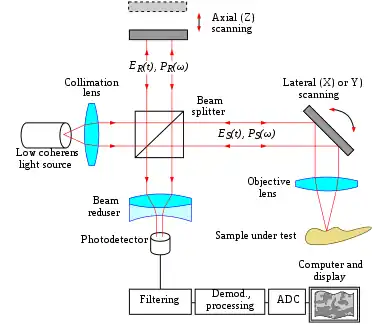 La lumière dans un système OCT est divisée sur 2 bras : un bras échantillon (qui contient l’objet que l’on veut imager), et un bras de référence (le plus souvent un miroir). La combinaison de la lumière réfléchie par l’échantillon et de celle provenant de la référence donne lieu à des interférences, mais seulement si la lumière a parcouru la même distance dans chacun des bras, à une longueur de cohérence près. En balayant le miroir de bras de référence, un profil de réflectivité de l’échantillon peut être obtenu (c’est de l’OCT temporel). Les parties de l’échantillon qui retroréfléchissent beaucoup de lumière donneront plus d’interférence que les autres, créant ainsi un contraste. Toute lumière réfléchie à partir d’un autre plan en profondeur dans l’échantillon aura parcouru une distance trop grande (supérieure à la longueur de cohérence de la source) et n’interfèrera pas[16].