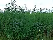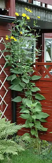 C'est une plante vivace, caduque, très rustique, résistante au froid, qui peut devenir envahissante à cause de ses rhizomes tubérisés. Elle peut atteindre jusqu'à trois mètres de haut, avec de fortes tiges, très robustes. Son cycle est annuel.