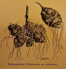 Le nom vernaculaire « topinambour » résulte de la francisation du nom d'une tribu du Brésil, les Topinamboux (aujourd'hui dénommés Tupinambas)[16], dont plusieurs membres furent amenés comme curiosité d'abord à Rouen en 1550[17], puis à Paris en 1613[2],[18], soit à la même époque que l'introduction du topinambour en France, ce qui conduira Carl von Linné, un siècle plus tard, à croire à l'origine brésilienne de la plante.