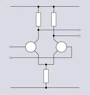 ![]() Figure 1.15 . Amplificateur équilibré, tel l'amplificateur de paire à longue queue |