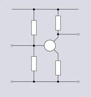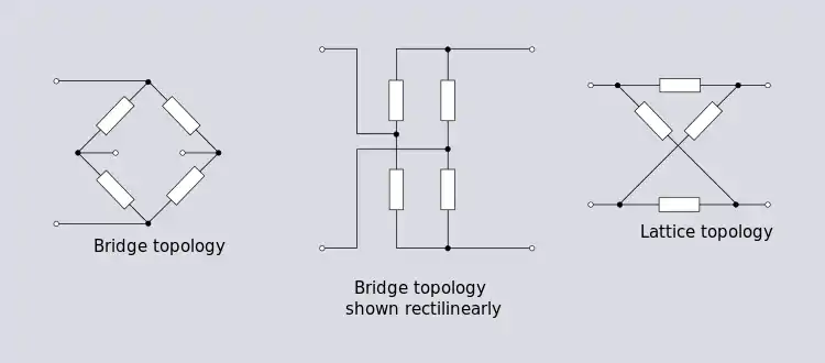 Il est normal de qualifier un réseau de topologie de pont uniquement si on l'utilise comme un réseau à deux ports où les ports d'entrée et de sortie sont chacun constitués d'une paire de nœuds diagonalement opposés. On peut considérer la topologie de boîte de la figure 1.7 identique à la topologie de pont, mais dans le cas du filtre, les ports d'entrée et de sortie seront chacun une paire de nœuds adjacents. On inclut parfois dans la topologie de pont la composante de chargement (ou d'indication nulle) sur le port de sortie du pont, tel qu'illustré à la figure 1.9[7].