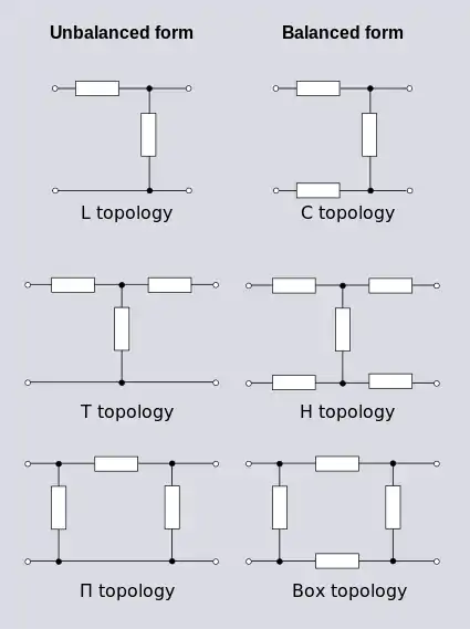 Les topologies dans la figure 1.7 sont communément utilisées dans la conception de filtres et d'atténuateurs. La topologie en L est identique à celle du diviseur de potentiel. La topologie en T est identique à celle en Y. La topologie en Π est identique à celle en Δ.
