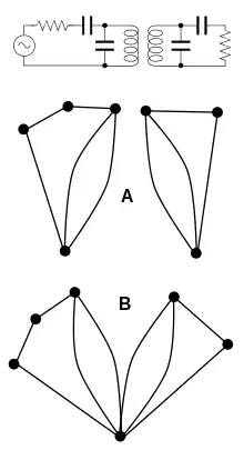 Dans la représentation graphique classique des circuits, il n'existe aucun moyen de représenter explicitement les couplages inductifs mutuels, comme cela se produit dans un transformateur. De tels composantes peuvent entraîner un graphe déconnecté avec plus d'une partie distincte. Pour faciliter l'analyse, un graphe à plusieurs parties peut être combiné en un seul graphe. Pour ce faire, on unifie un nœud de chaque partie en un seul nœud.Le comportement théorique du circuit ne s'en trouve pas modifié, de sorte que l'analyse effectuée sur celui-ci est toujours valide. Cependant, en pratique, si un tel circuit devait être mis en œuvre, le comportement changerait, car le circuit détruirait l'isolement entre les pièces. Un exemple serait un transformateur mis à la terre des côtés primaire et secondaire. Le transformateur fonctionnerait toujours comme un transformateur avec le même rapport de tension, mais ne pourrait plus être utilisé comme transformateur d'isolement[45].