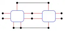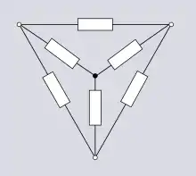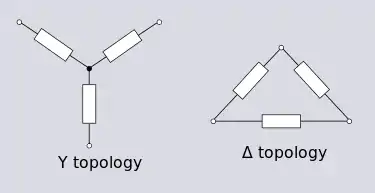 Un exemple d'un tel réseau est illustré à la figure 1.6, où on a un réseau Y connecté en parallèle avec un réseau Δ. Supposons que l'on veuille calculer l'impédance entre deux nœuds du réseau. Souvent, cela peut se faire par applications successives des règles de combinaison des impédances série ou parallèle. C'est toutefois impossible dans ce réseau, car il faut utiliser la transformée Y-Δ en plus des règles en série et parallèle[4]. La topologie Y se nomme également topologie en étoile. Cependant, la topologie en étoile peut aussi référer au cas plus général de n mailles connectées au même nœud plutôt que trois[5].