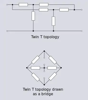 Une topologie à double T existe aussi avec des applications pratiques où il est souhaitable que les entrées et les sorties partagent une borne de masse. Un exemple d'un tel cas est lorsque les connexions d'entrée et de sortie sont faites avec une topologie coaxiale. Une topologie de pont normale ne permet pas la connexion entre une borne d'entrée et de sortie. Pour cette raison, la topologie à double T est utilisée dans les cas où un pont serait par ailleurs utilisé pour des applications d'équilibrage ou de mesure nulle. Cette topologie est également utilisée dans l' oscillateur à double T comme générateur d'onde sinusoïdale. La partie inférieure de la figure 1.11 montre une topologie à double T redessinée dans le but de souligner la connexion avec la topologie de pont[8].
