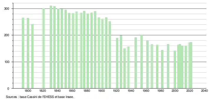 L'évolution du nombre d'habitants est connue à travers les recensements de la population effectués dans la commune depuis 1793. Pour les communes de moins de 10 000 habitants, une enquête de recensement portant sur toute la population est réalisée tous les cinq ans, les populations légales des années intermédiaires étant quant à elles estimées par interpolation ou extrapolation[31]. Pour la commune, le premier recensement exhaustif entrant dans le cadre du nouveau dispositif a été réalisé en 2004[32].