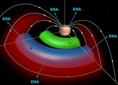 Un schéma écorché de l'environnement spatial de la planète géante gazeuse Jupiter, montrant des ions de radiation magnétiquement pris au piège[Quoi ?] (en rouge), le tore de gaz neutre de la lune Io (en vert) et le tore de gaz neutre de la lune Europe (en bleu) découvert grâce à la sonde spatiale Cassini.