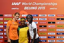 Tori Bowie célébrant le titre olympique du 4 x 100 m lors des Jeux olympiques de Rio de Janeiro en 2016. | |||||||||||||
