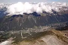 Vue depuis l'aiguille du Midi au sud-est de la vallée de Chamonix avec le torrent de la Creuse sur la gauche.