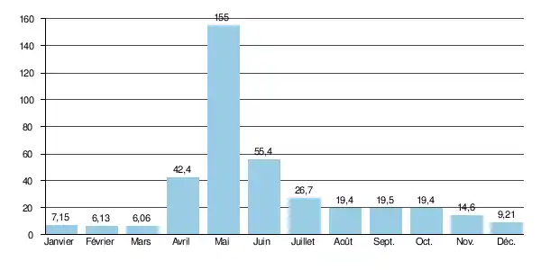En ce qui concerne la période estivale, libre de glaces (de mai à septembre inclus), le débit minimal observé a été de 5,42 m3/s en .