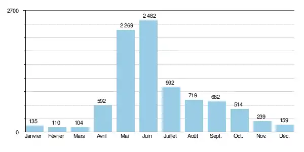 Le débit moyen mensuel observé en mars (minimum d'étiage) est de 104 m3/s, soit à peine 4 % du débit moyen du mois de mai (2 482 m3/s), ce qui souligne l'amplitude importante des variations saisonnières. Sur la durée d'observation de 59 ans, le débit mensuel minimal a été de 62 m3/s (), tandis que le débit mensuel maximal s'élevait à 5 620 m3/s ().