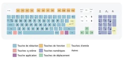 - Clavier de PC d’IBM de PS/2 : des touches F1 à F12 habituellement placées dans trois groupes de quatre en haut du clavier (les claviers originaux de PC d’IBM et de PC XT ont les touches de fonction F1 à F10, dans deux rangées verticales adjacentes en côté gauche). Beaucoup de claviers modernes de PC incluent également des touches spécialisées pour des fonctions multimédia et des fonctions du système d’exploitation.