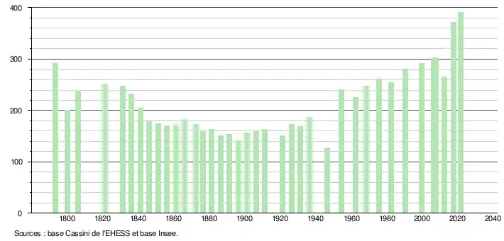 L'évolution du nombre d'habitants est connue à travers les recensements de la population effectués dans la commune depuis 1793. Pour les communes de moins de 10 000 habitants, une enquête de recensement portant sur toute la population est réalisée tous les cinq ans, les populations légales des années intermédiaires étant quant à elles estimées par interpolation ou extrapolation[18]. Pour la commune, le premier recensement exhaustif entrant dans le cadre du nouveau dispositif a été réalisé en 2007[19].