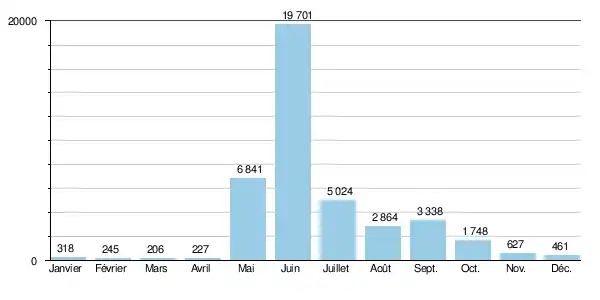 Le débit moyen mensuel observé en avril (minimum d'étiage) ne se monte qu'à 227 m3/s, soit à peu près 100 fois moins que le débit moyen du mois de juin (19 701 m3/s), ce qui témoigne de la très forte amplitude des variations saisonnières. Sur la période d'observation de 58 ans, le débit mensuel minimal a été de 27,8 m3/s () - il s'agissait d'un hiver exceptionnellement sec -, tandis que le débit mensuel maximal s'est élevé à 31 500 m3/s ().