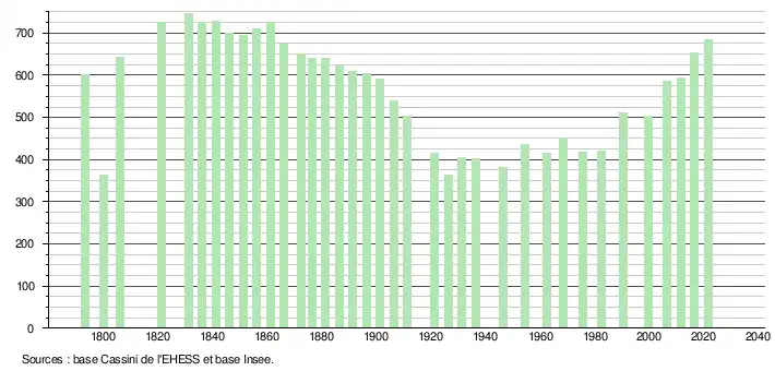 L'évolution du nombre d'habitants est connue à travers les recensements de la population effectués dans la commune depuis 1793. Pour les communes de moins de 10 000 habitants, une enquête de recensement portant sur toute la population est réalisée tous les cinq ans, les populations légales des années intermédiaires étant quant à elles estimées par interpolation ou extrapolation[25]. Pour la commune, le premier recensement exhaustif entrant dans le cadre du nouveau dispositif a été réalisé en 2006[26].