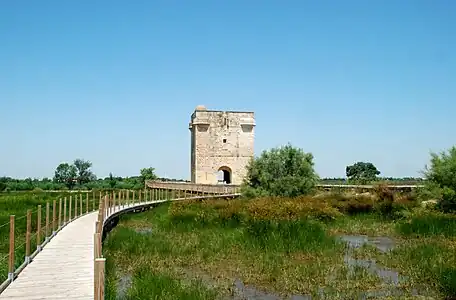 - La tour Carbonnière vue depuis le sentier de découverte et le marais