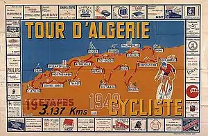 Le premier Tour d'Algérie professionnel est organisé en 1949[3]. Entre le et le , les concurrents parcourent 2 707 kilomètres en 19 étapes. Partant d'Alger les coureurs prennent la direction Ouest, ils font étape à Orléanville (maintenant Chlef), Mostaganem, Oran, Tlemcen, puis cap au Sud via Sidi Bel Abbes, s'orientent vers l'Est, traversent les montagnes de l'Atlas, en la plus longue étape (254 km) et par Tiaret, Aumale, Bousaâda, arrivent à Sétif, à mi-course à peu près. C'est ensuite Biskra, Constantine et l'étape orientale Souk Ahras- Bône. Le retour vers Alger est ponctué d'étapes aux ports de Philippeville, Bougie, puis en Kabylie à Tizi Ouzou, veille de l'arrivée. Le simple énoncé du parcours montre l'immensité de la tâche des organisateurs, qui reçoivent l'aide des services coloniaux.