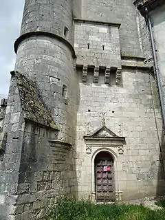 La porte en plein cintre est surmontée d'un fronton dont les ornements ont été détruits.