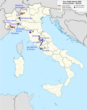 | 1re étape | 30 juin | Formello – Formello | contre-la-montre individuel | 5,2 | ||