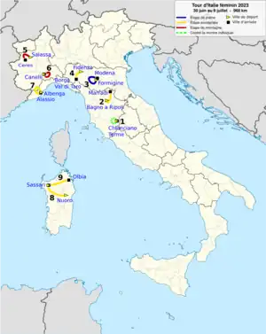 La course débute en Toscane avant de se rendre en Émilie-Romagne, au Piémont, en Ligurie avant de finir en Sardaigne. Il a une étape de moins que l'année précédente. Elle commence avec un contre-la-montre de quatre kilomètres, tout plat. La seconde étape comporte le Passo della Colla comme unique difficulté. Une fois passé, le parcours est en descente jusqu'à l'arrivée quinze kilomètres plus loin. La troisième étape est globalement plate. L'étape suivante est vallonnée avec trois montées classées. La dernière se situe à quatorze kilomètres de l'arrivée avec une descente par la suite. Elle peut couronner une puncheuse, mais également une sprinteuse. La cinquième étape est montagneuse, avec la montée du Passo del Lupo en début de parcours, puis celle de Vietti et Sant'Ignazio à la fin. La sixième étape et vallonnée et à priori propice aux échappées. L'arrivée est en côte. La septième étape est difficile avec deux ascensions avant l'arrivée au sommet à Alassio. Après une journée de repos, la course parcourt la Sardaigne. La huitième étape ondule, mais la fin est globalement en descente avant l'arrivée en montée. La dernière étape présente un profil similaire avec de petites difficultés, mais une très longue phase descendante sur la fin, ce qui favorise une arrivée groupée[1].
